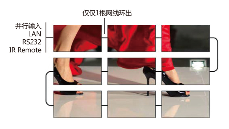 控制信號(RS232\LAN\IR Remote)通過一根網(wǎng)線(RJ45)環(huán)出;最大 可支持100臺(tái)顯示器的菊花鏈,有助于減少連接線纜和人力成本。